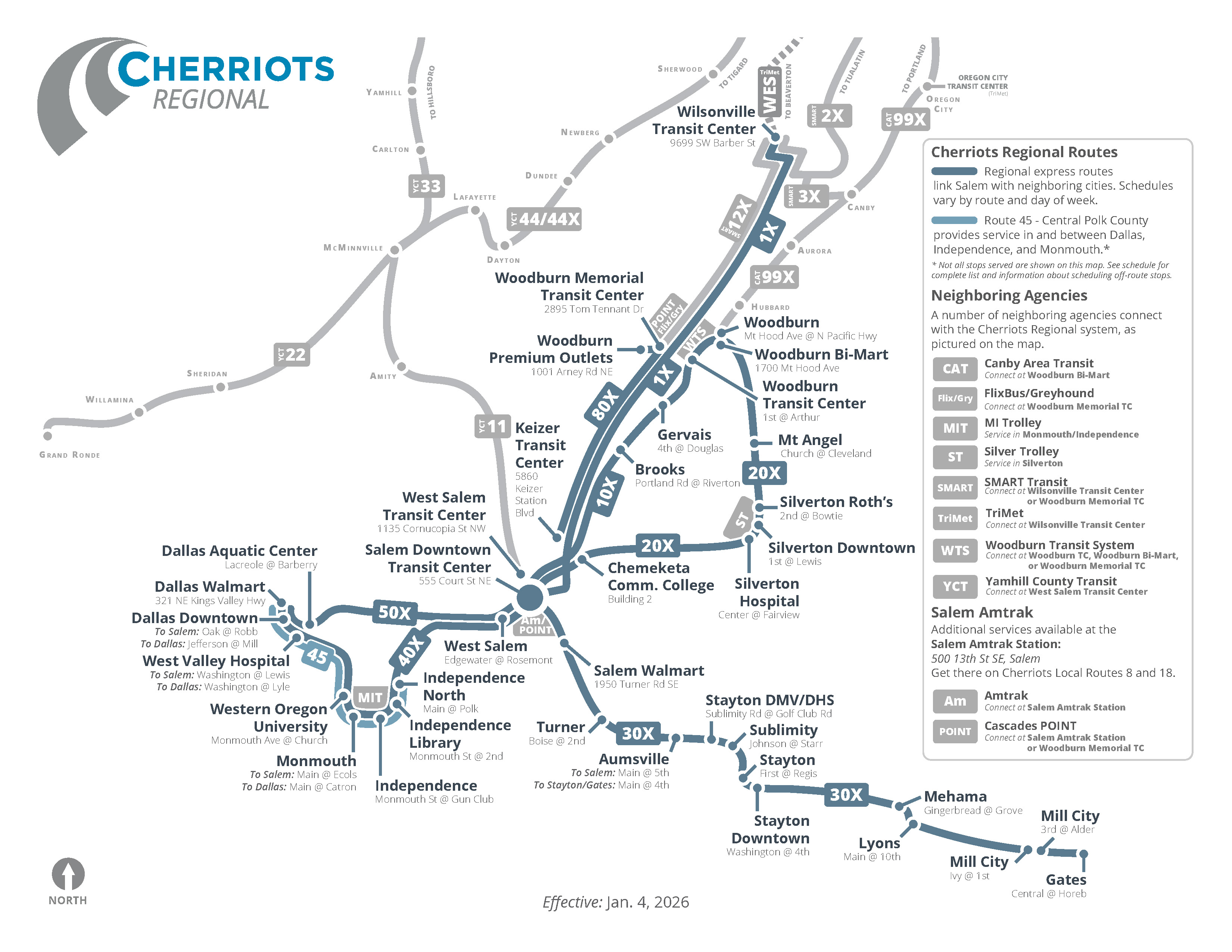 If you live in Marion or Polk counties, Cherriots Regional connects you with the places you want to go. Most Cherriots Regional buses run Monday through Saturday and Express Routes 1X, 10X, 20X, 30X, 40X, and 50X all connect to the Salem Downtown Transit Center. Express Route 80X runs on weekdays and connects the Keizer Transit Center to the Wilsonville Transit Center via the Woodburn Memorial Transit Center. Route 45 provides service in and between Dallas, Monmouth, and Independence. Our area partners also connect with Cherriots Local and Cherriots Regional to provide service to Grand Ronde, Lincoln City, McMinnville, Canby, and beyond.